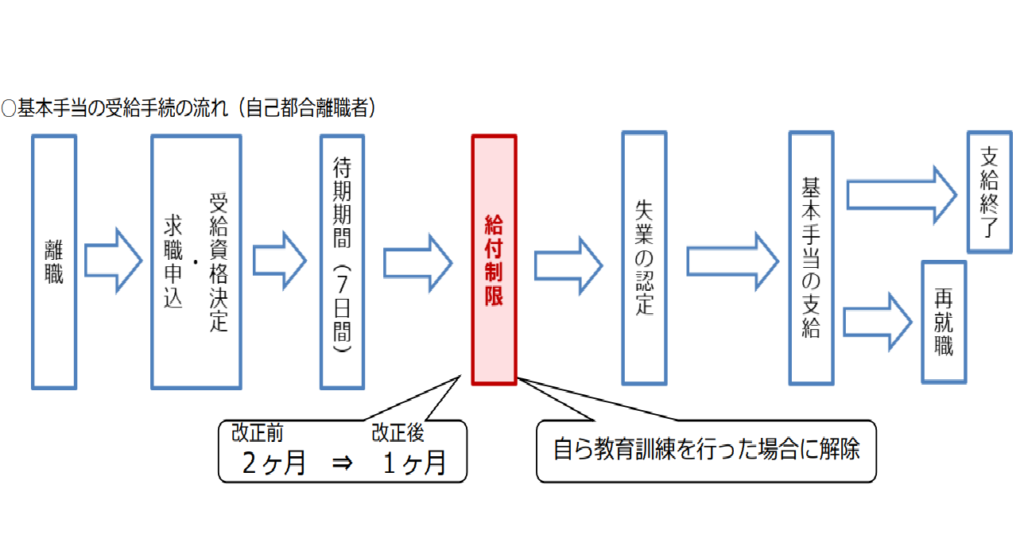 失業保険が受給しやすくなりました。 まず給付制限期間が2か月から1か月に短縮されました。