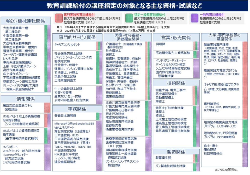 続いて教育訓練給付です。 こちらはリスキリングや資格獲得等のための勉強費用を最大70%国が負担してくれる制度です。