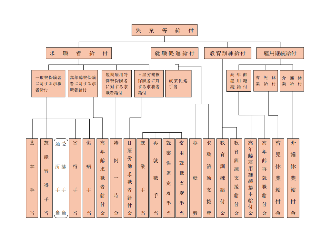 こちらの厚生労働省資料に雇用保険による給付金・手当の種類の記載があります。 左下の基本手当から右下の介護休業給付金まで、多種多様です。 こちらの代表的なものだけ簡単解説します。