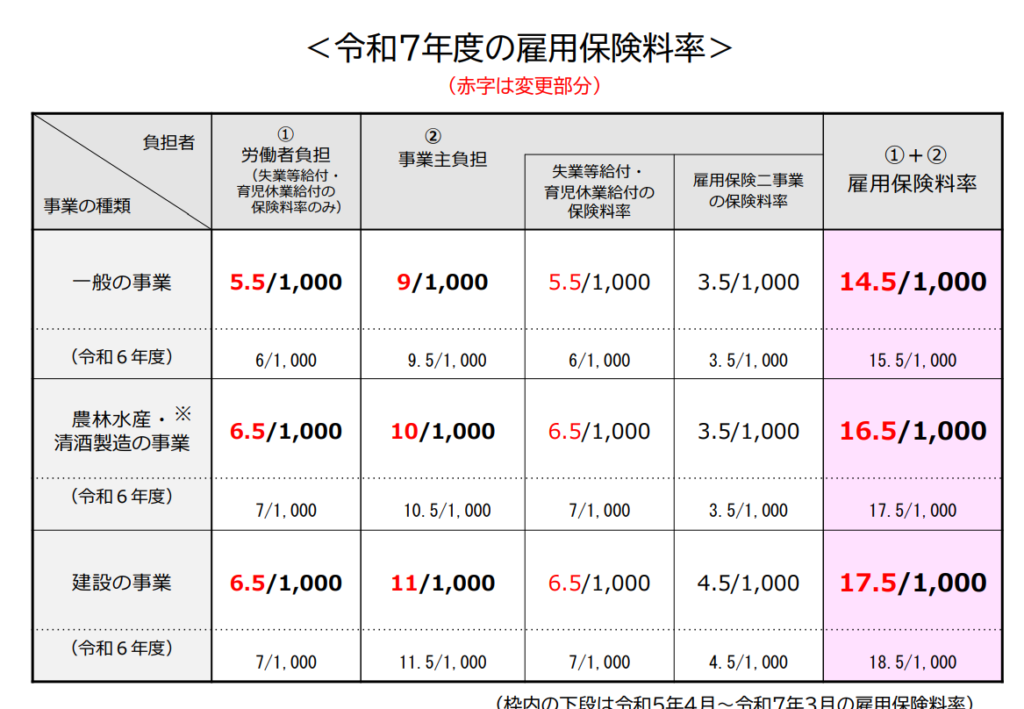 一般の事業の場合、労働者負担は賃金の5.5/1000、それに事業者負担9/1000を加算した金額が雇用保険料として支払われる金額となります。 一般の事業以外の農林水産・清酒製造事業、建設事業の場合、統計上失業リスクが高くなっています。 そのため、雇用保険の料率も一般事業より高くなっているというわけです。
